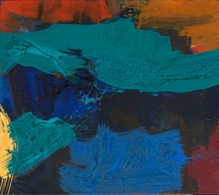 Chanson, 2013, has a dark indigo background, with short strokes of orange, red and yellow evoking the lights of a city after hours. Across the top of this painting, a wobbly stroke of turquoise dangles like a ruffled ribbon. Night Window, 2013, also evokes a city after dark, but in this canvas the velocity of Gagnier’s strokes have the speed of highway traffic. In one corner of the wet-into-wet painting, scarlet red marbleizes with vermillion while tiny lemon-yellow dots sprayed across the canvas look like reflections on glass.