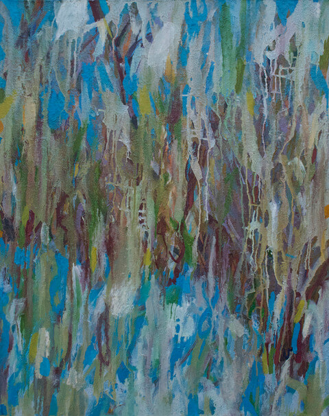 In Daphne Versus, 2013, light green strokes sweeping across dappled pale blue evokes trees against sky. In the catalog accompanying the exhibition Gagnier says these works are “inscapes,” studio creations that “evolved from years of painting landscape on site.”