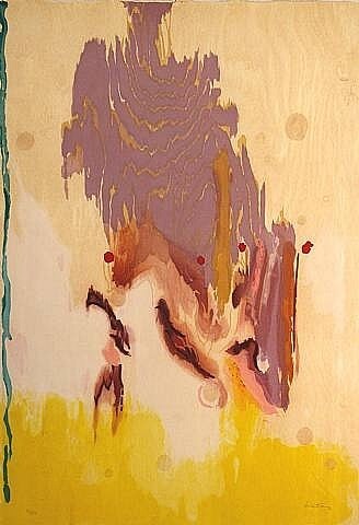 Frankenthaler took improvisation to new heights. In a 2003 interview with Ted Loos, Frankenthaler noted that “her decision-making process was wholly unregimented. ‘There is no ‘always,’… No formula. There are no rules. Let the picture lead you where it must go.” This experimental, free form approach to painting also led her to make unprecedented strides in abstract printmaking – particularly woodblock printing. Through overprinting (sometimes thirty or more layers) she was able to emulate the fluid, process oriented mark-making also found in her poured painting.