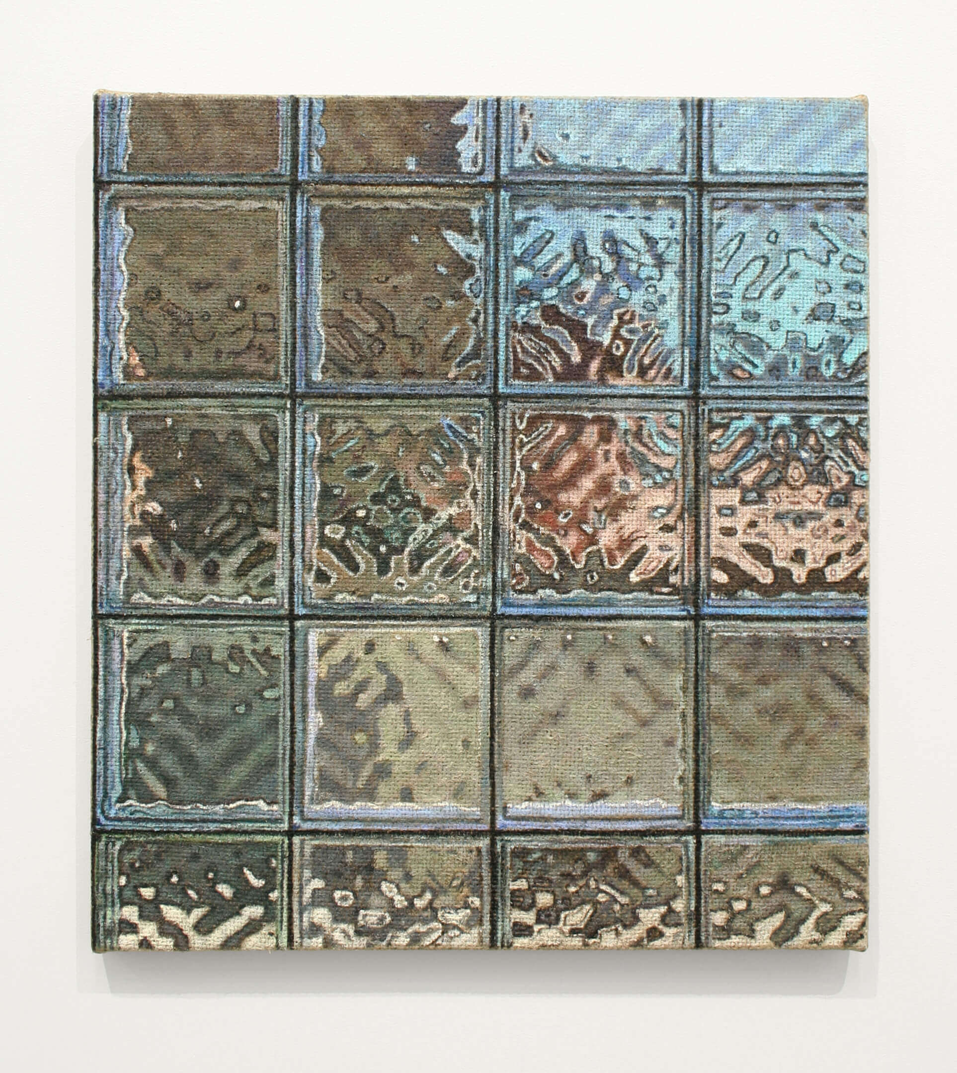 In her current show at Klaus von Nichtssagend, Jennifer J. Lee also evokes the pixel by painting on extremely coarse jute – the weave of the material together with a moderately dry brush creating the lo-res effect. To me, these paintings were at their best when the depicted subject had a surface that was absolutely opposed to the fabric on which it was painted – things like plastic chairs, brass horns, and various kinds of glass. Window III (2018), the largest painting in the show at 21” x 19,” was quite amazing, creating an extremely convincing illusion of glass brick, with an indistinct landscape visible outside. In a 101-level painting the class, one of the first things one learns is that surfaces should be prepared according to what you’re planning to paint on them – Lee turns that formula on its head to very good effect. That particular painting, more so than any other in the show, also makes a strong nod toward abstraction; the grid is completely frontal, lines up precisely with the left-hand edge, and the proportion of the individual glass bricks is roughly the same as the overall shape. As much as I enjoyed the show, the paintings of landscape, bereft of that weird contrast between subject and surface, didn’t resonate quite as strongly.