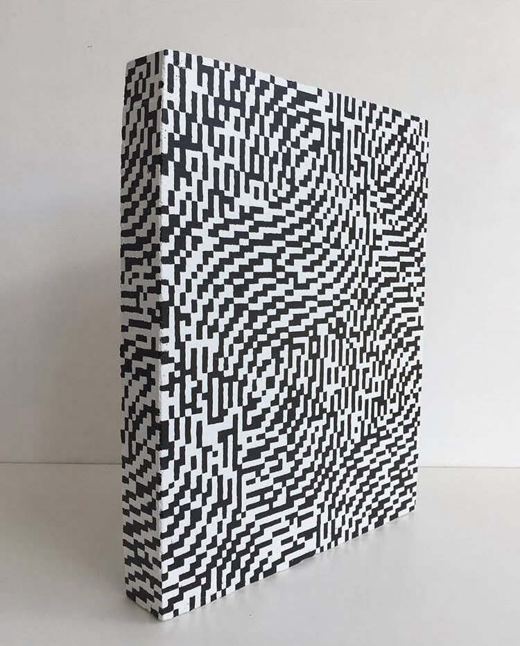 A few blocks away from Jim Osman’s painterly sculptures, Robert Otto Epstein has an exhibition of sculptural paintings (I think) at High Noon gallery. The painted cement vase shapes one finds there are fundamentally frontal and have a depth not much thicker than extra-wide stretcher bars. The artist told me that he had actually considered hanging them on the wall, but the weight of the pieces was too great (the show is called This Is Heavy). For me, the table-top presentation was definitely the way to go, because the work’s objecthood is too front and center to be presented as bas relief. In the entrance gallery, the pieces are covered with gridded hieroglyphics, but in the main space the application of color, sometimes black and white, sometimes in a candy-colored rainbow, brings me back to where I started this essay – the pixelated low tech video game motif is used to great effect here, and the flickering light that it suggests keeps the pieces from looking and feeling like they weigh a ton, even though they do. While I very much enjoyed the vase shapes, I felt a special affinity for e%75fH8190z? (2018) which took the form of a little black and white tombstone sitting on the floor and in the corner, like it was being punished. I know it’s weird to feel empathy for a block of cement, but what can I say?